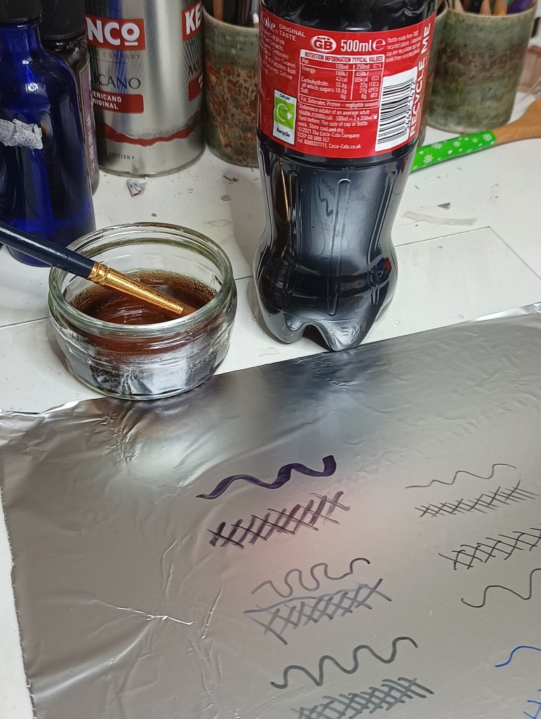 The process begins by sketching or painting your desired image using oil-based markers/ pencils on a sheet of aluminium foil. Once the artwork is complete and dry brush coke over the foil leaving it short time before wiping off. Using a regular household sponge soaked in water wipe the surface, then using a roller apply the ink using the wet sponge to remove any excess ink.