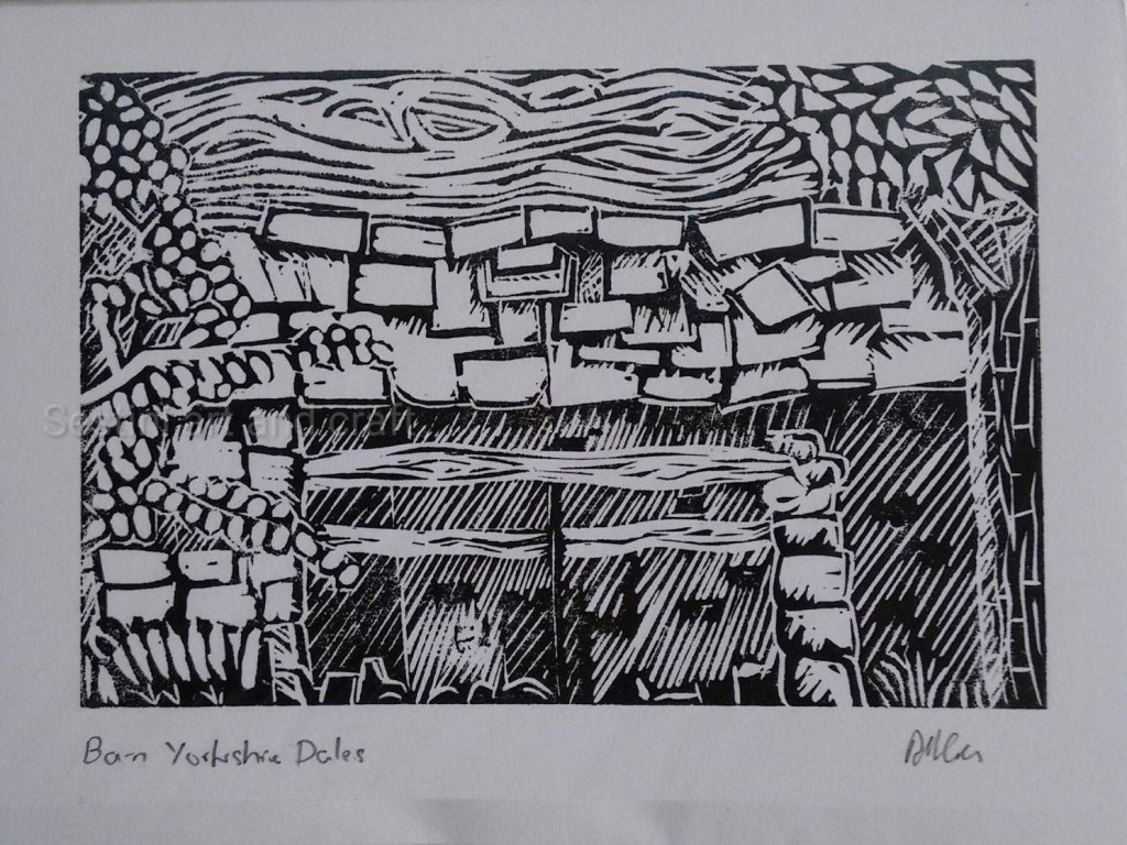 Original Drypoint engraving of limestone barns Yorkshire dales