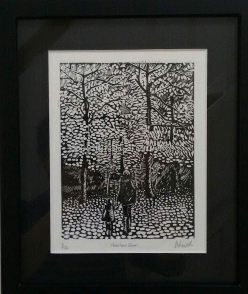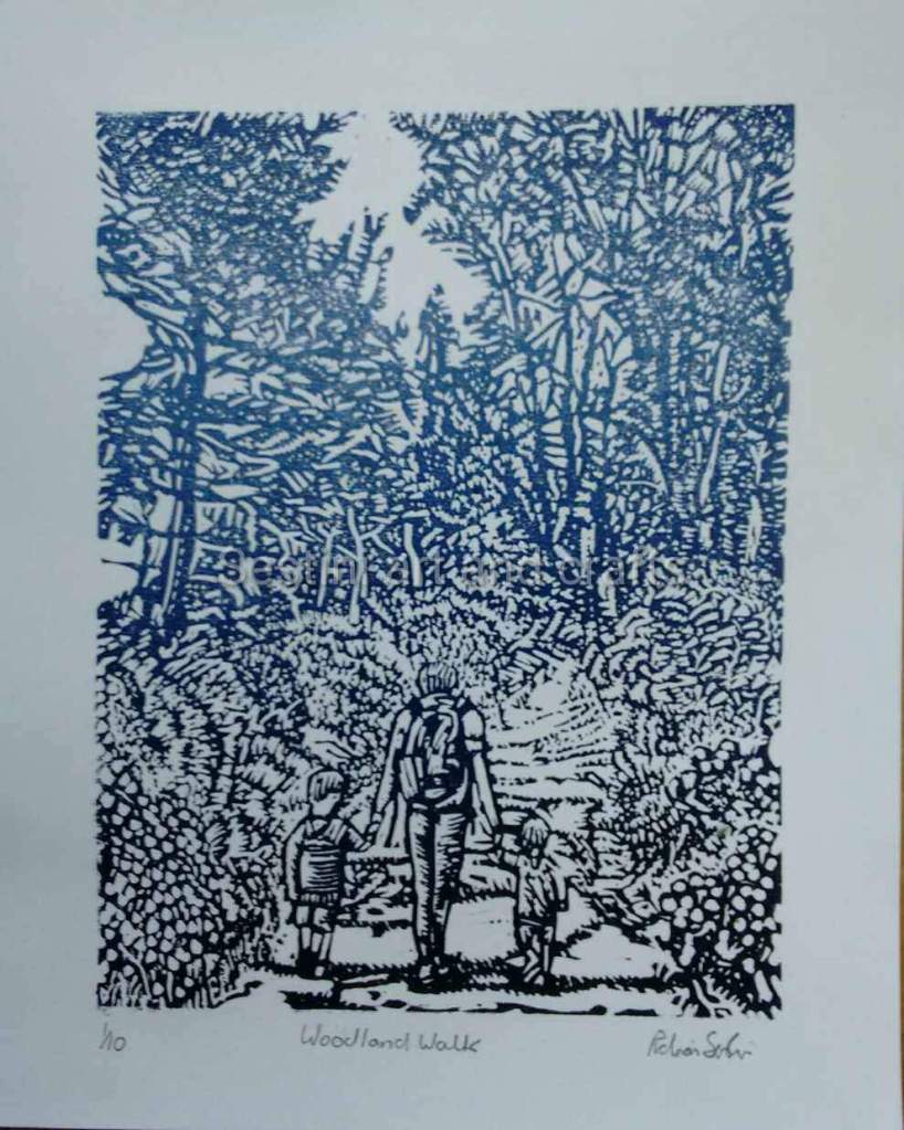 Mother and son walking in leaves at Harlow Carr woods, Harrogate Printed using oil based ink on Somerset acid free 250 g 10 x 14 in paper Print size 6″ x 8 ” in