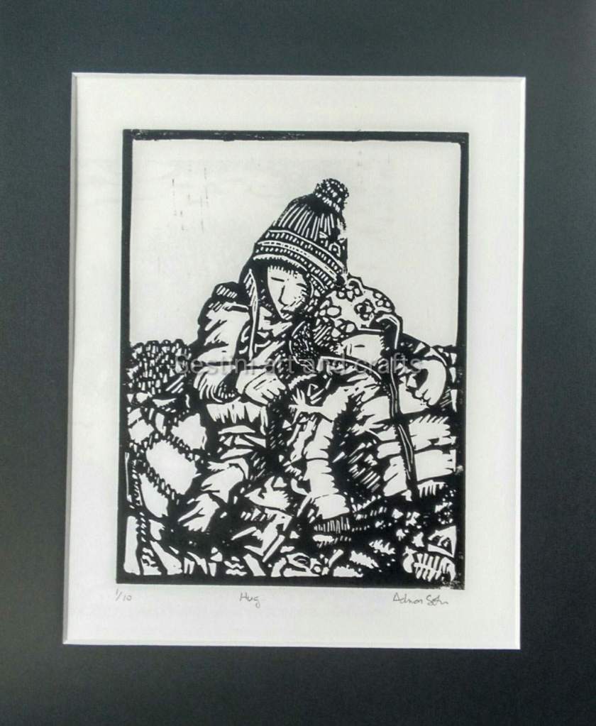 Hug and swinging on cold winters day Printed using oil based ink on strathmore acid free 120 g 8″ x 10 in Paper Print size 6″ x 8 ” in