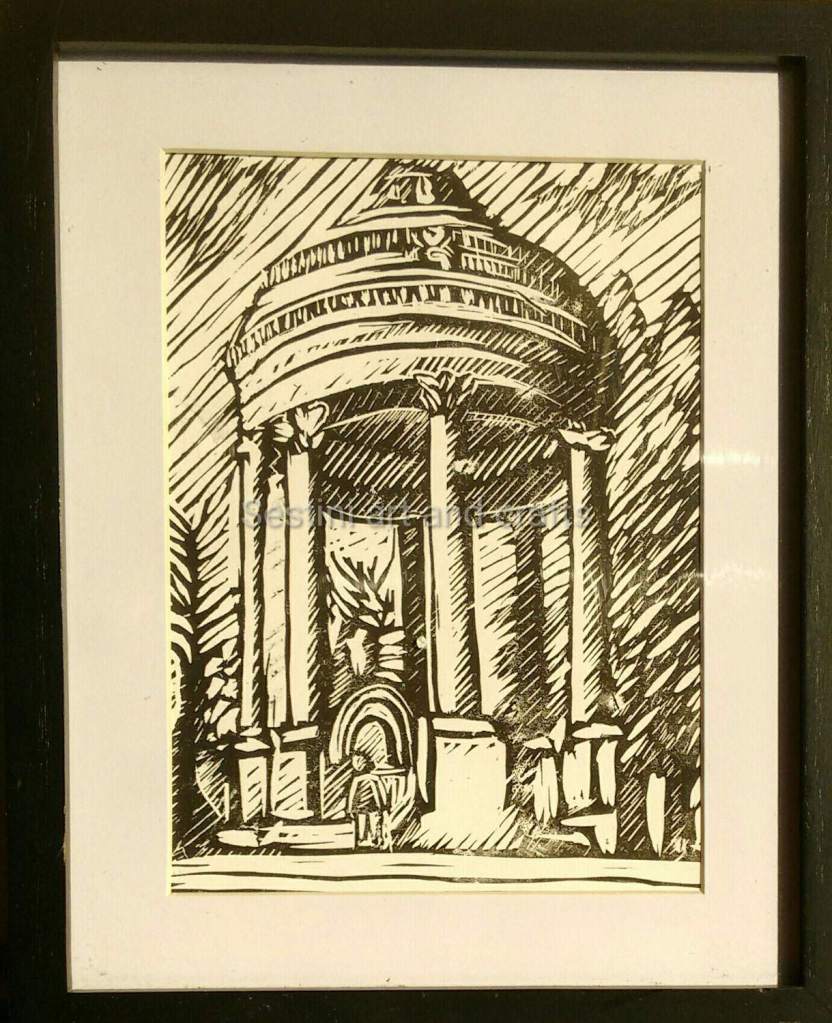 My son playing hide and seek on a winters day at Barran’s Fountain, Roundhay Park Leeds Printed using oil based ink on strathmore acid free 120 g 8″ x 10 in paper .Print size 6″ x 8 ” in