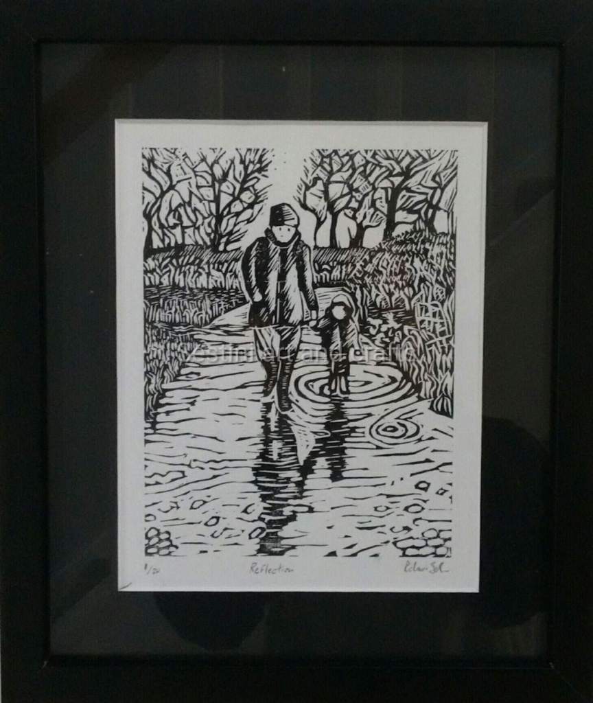 Mother and son walking at Yeadon tarn Son playing in puddles making ripples in reflections on water. Scenic walk which is close to the airport so you get planes flying over your head exiting for children Printed using oil based ink on strathmore acid free 120 g 8″ x 10 in paper Print size 6″ x 8 ” in