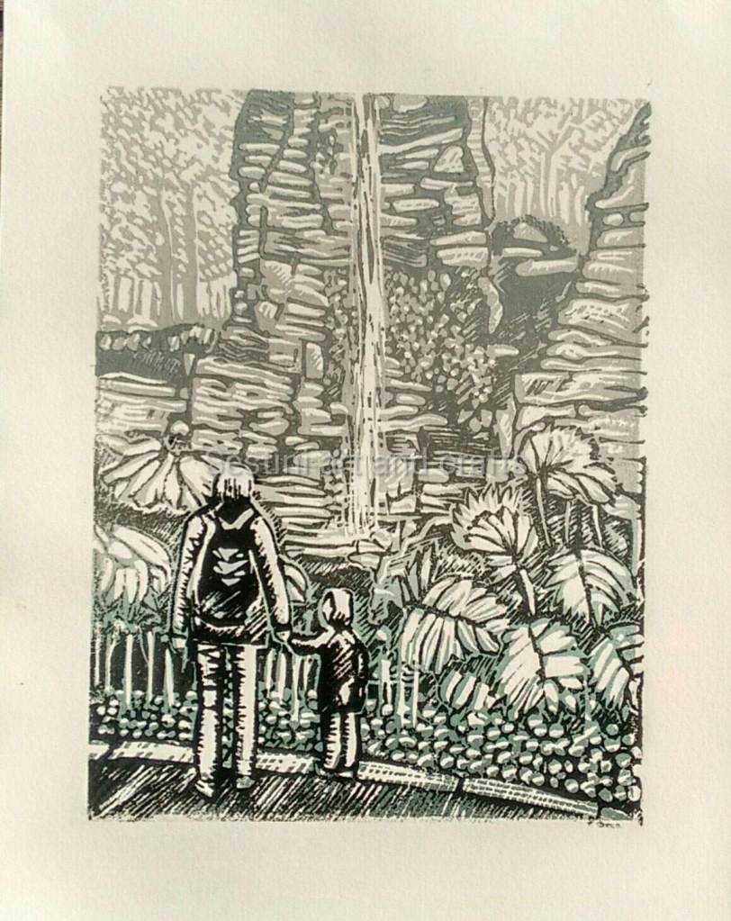 Mother and son at Chatsworth House: Rockery Waterfall This is a two block print The prints are a blend of colours ,light grey to light green first layer Grey to dark grey on second layer. Black on the last layer on people. Printed on white acid free paper 120 g Print size 6″ x 8 ” in